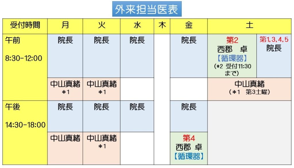 - 循環器外来(西郡卓医師)は、第2土曜午前・第4金曜午後におこなっております。