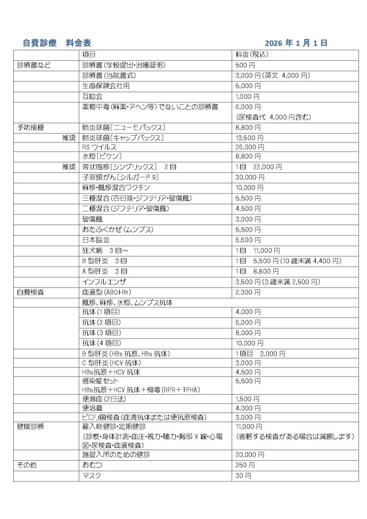 自費診療料金表(2026/1/1~)